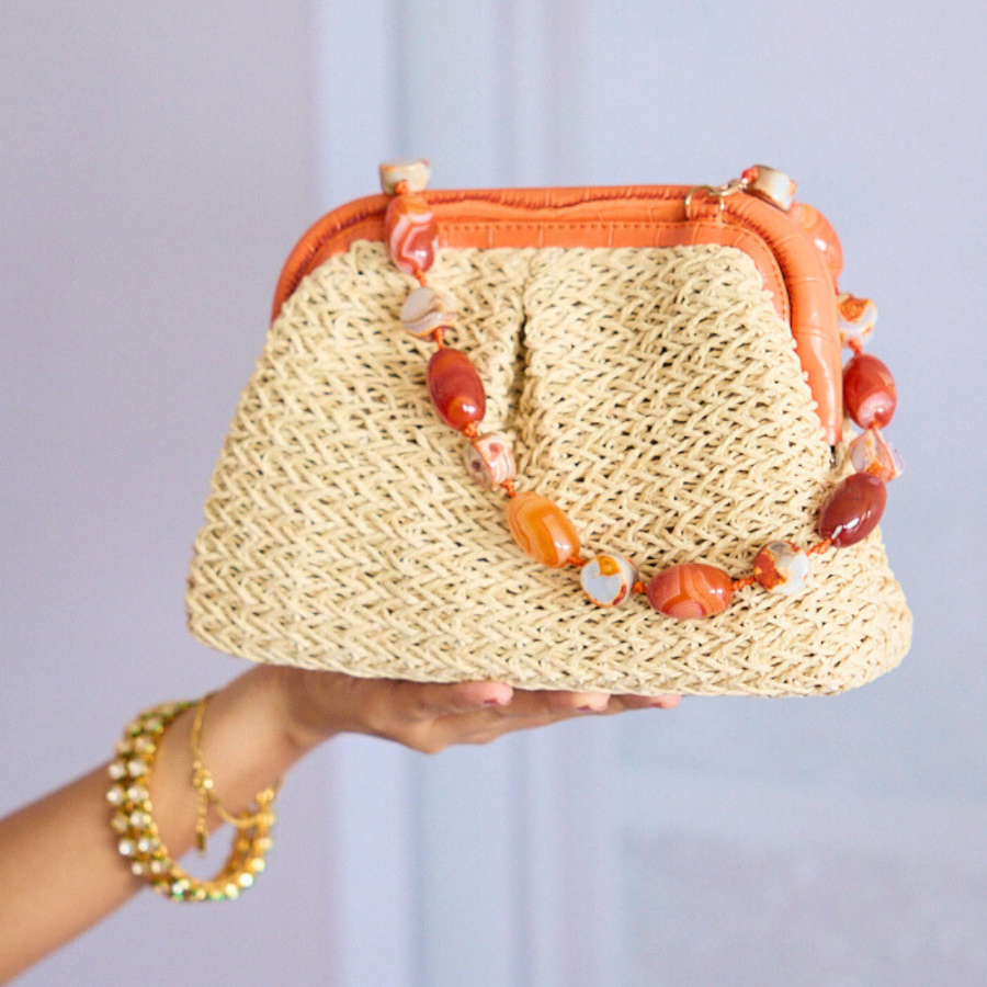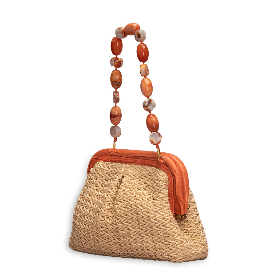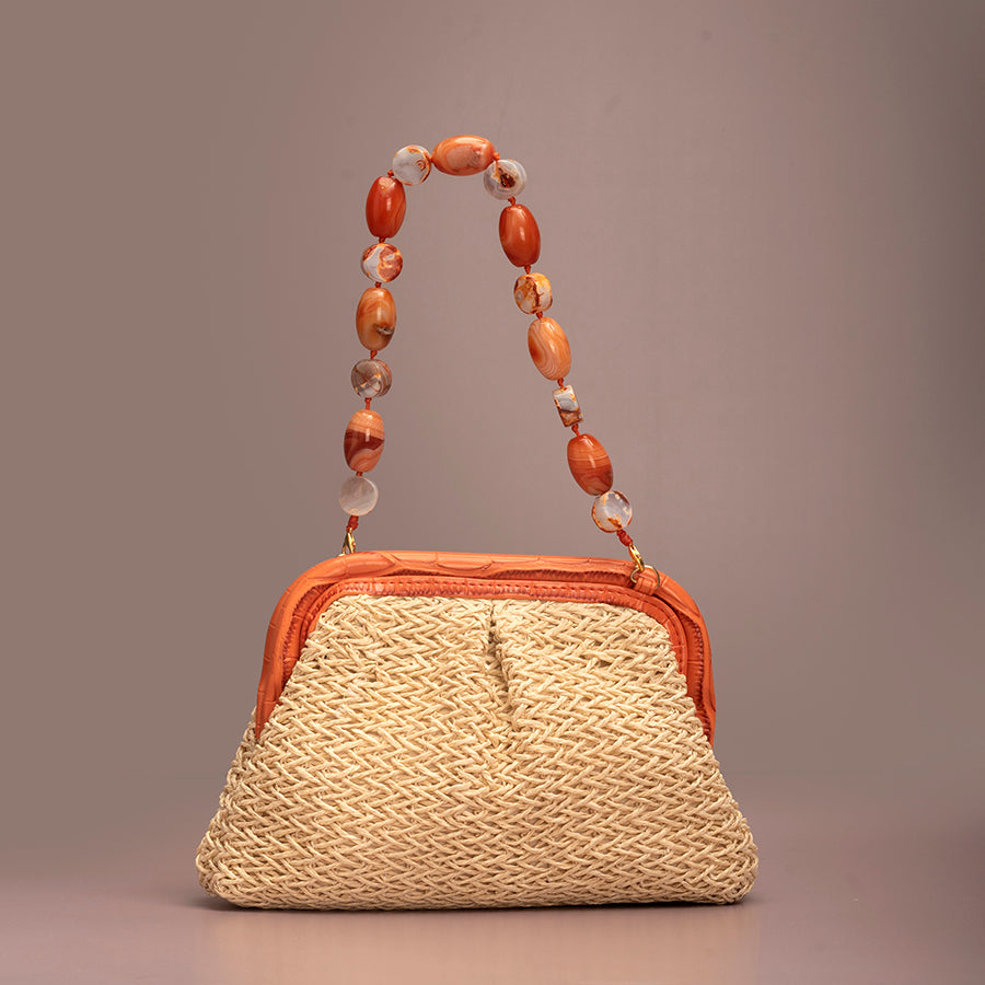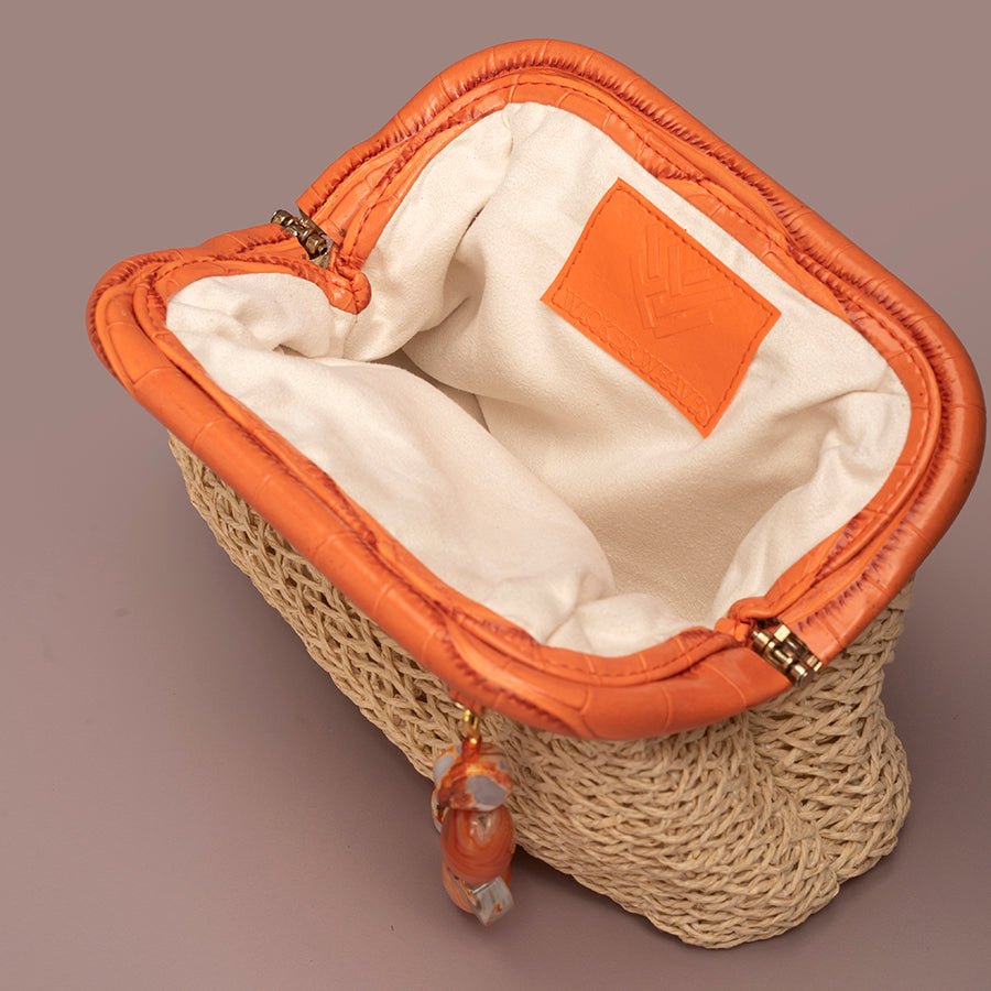 To be cleaned with a soft damp cloth and stored in a dust free bag provided along with the bag. Store it well due to the delicate nature of the bag.
