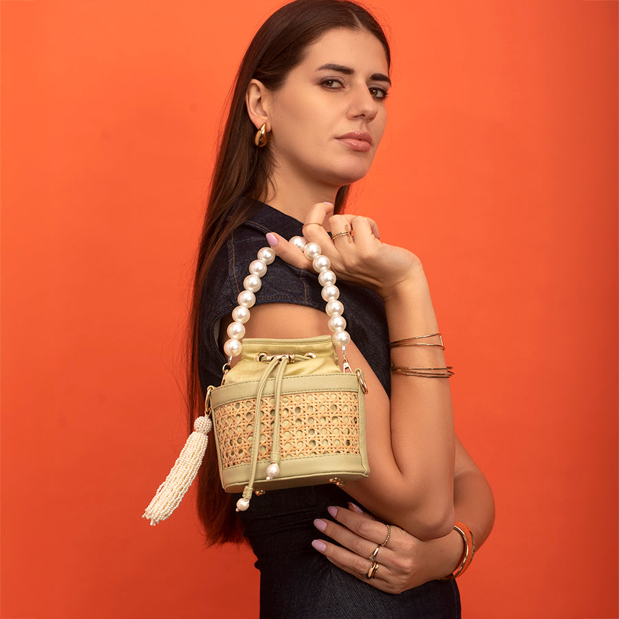 To be cleaned with a soft damp cloth and stored in a dust free bag provided along with the bag. Store it well due to the delicate nature of the bag.